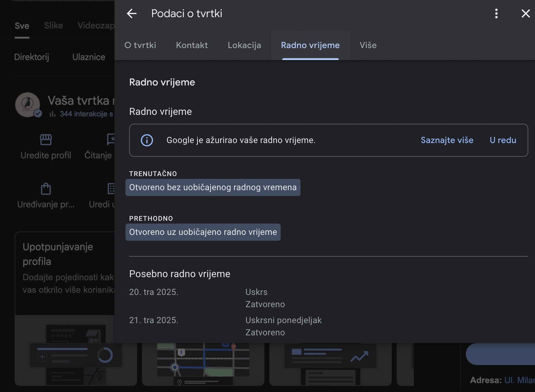Što ako zaboravim postaviti posebno radno vrijeme? Vaš profil će prikazivati redovno radno vrijeme, što može zbuniti korisnike. Bolje ikad nego nikad – ažurirajte čim prije.