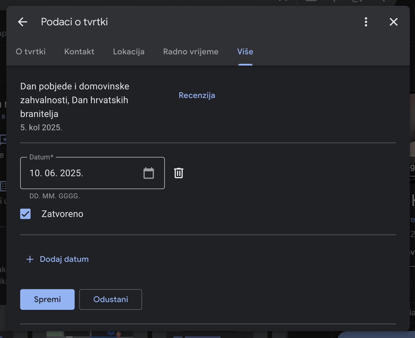 Kliknite na ikonu olovke pokraj opcije “Radno vrijeme”. Ispod redovnog radnog vremena nalazi se opcija “Dodaj posebno radno vrijeme”.